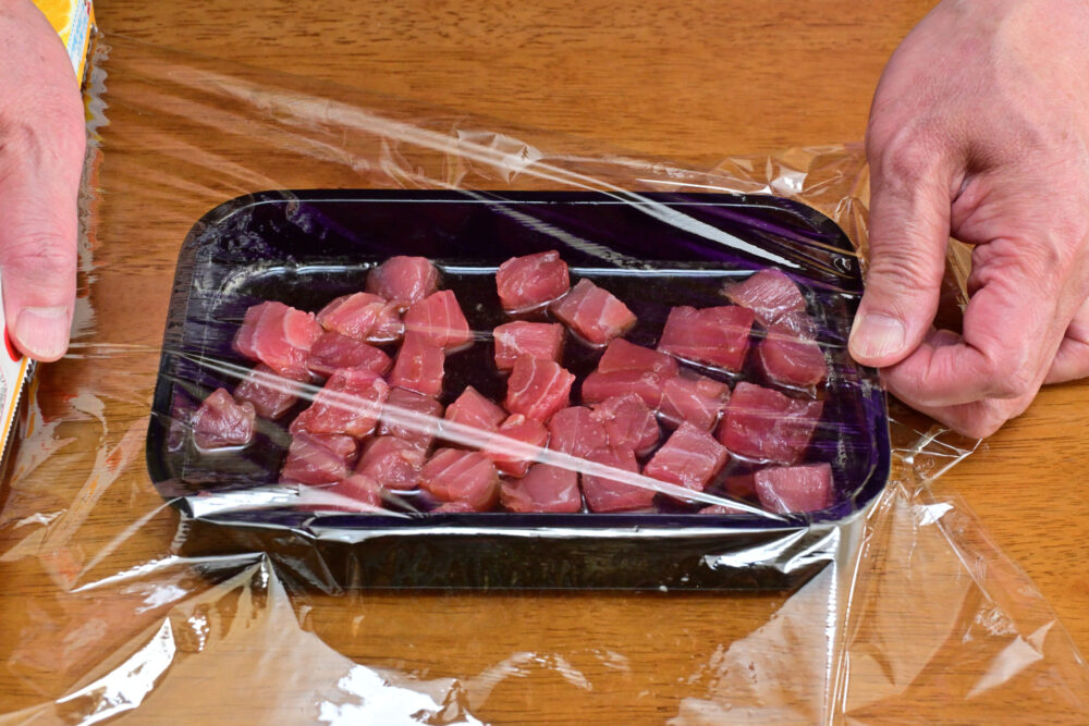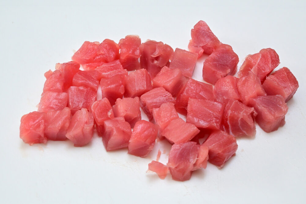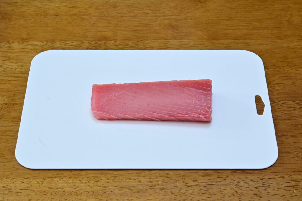 1. まぐろの冊を1.5cm程度のサイコロ状に切り分けます。