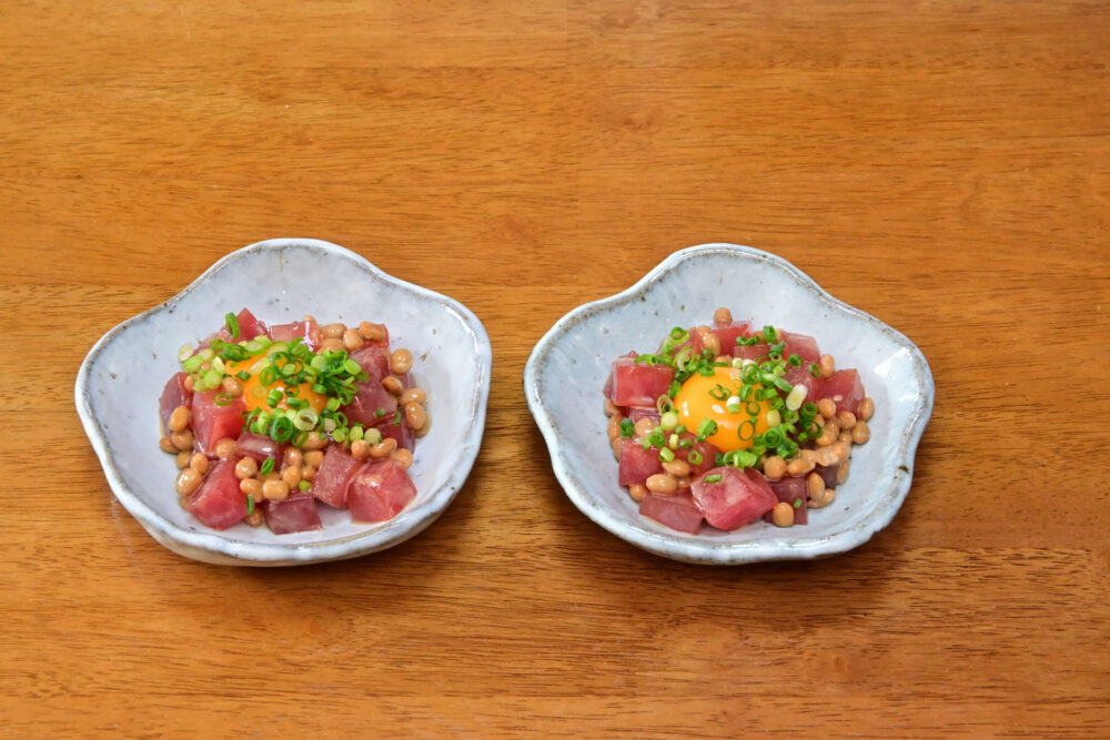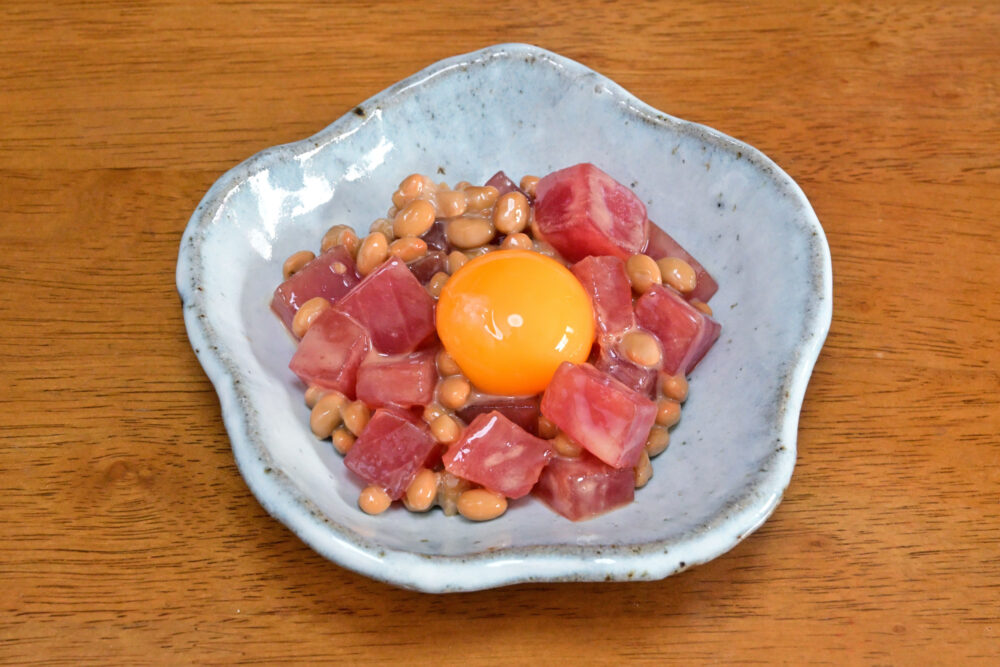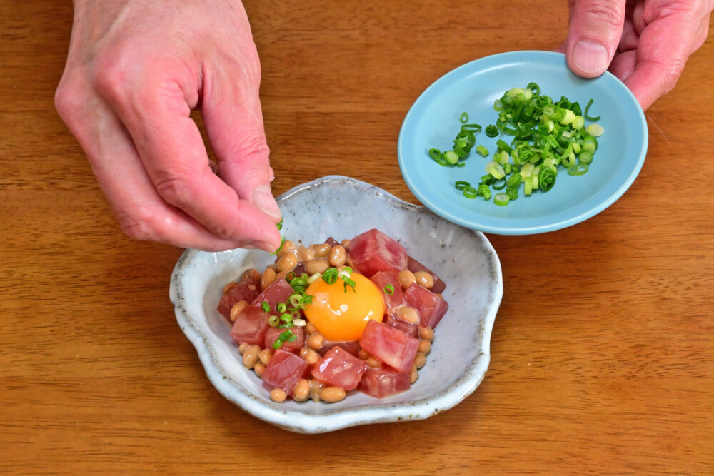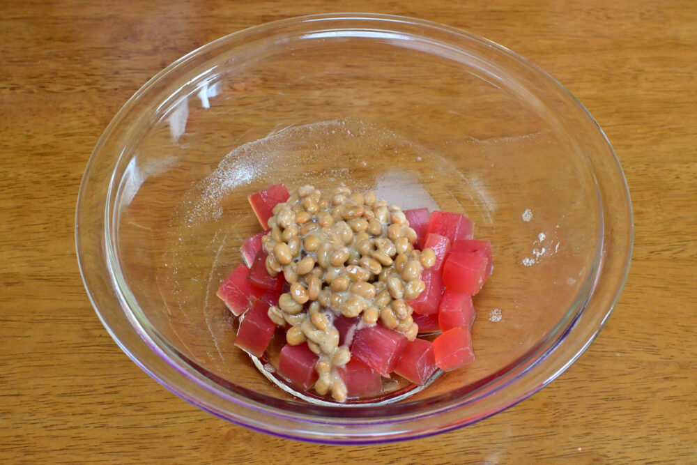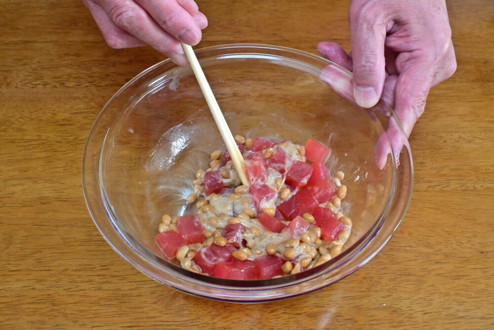 9. 漬け込んだまぐろに納豆を加え、丁寧に和えます。