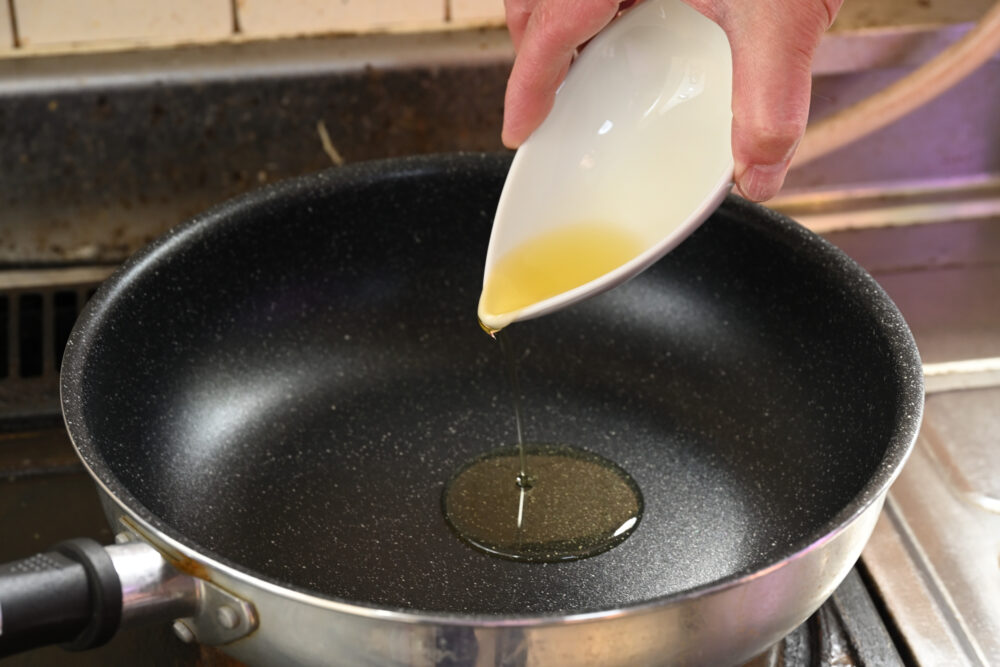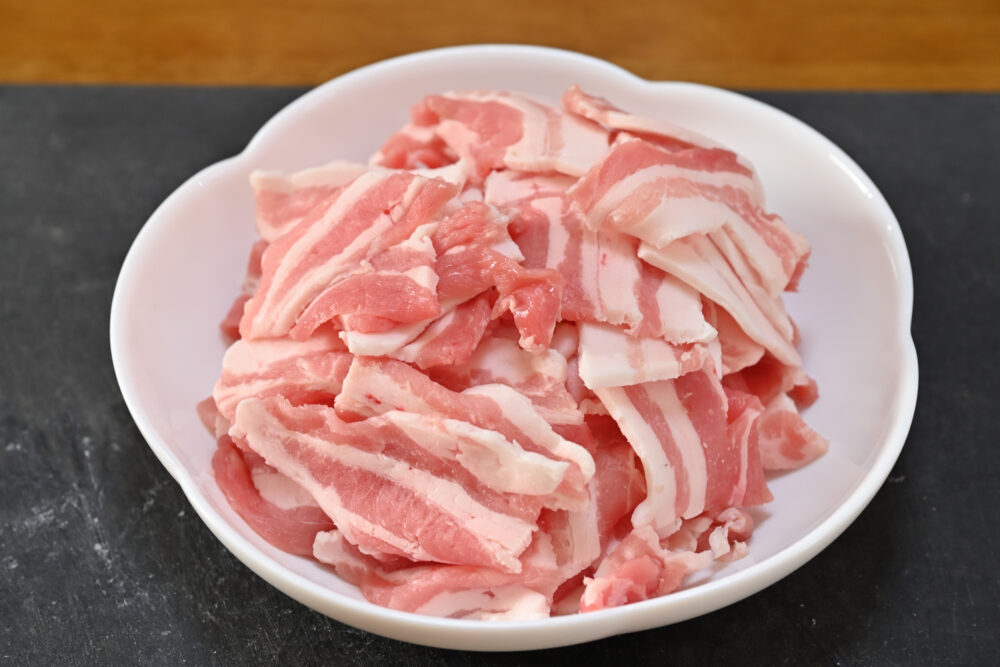 4. フライパンにごま油をひき、豚バラ肉を入れます。