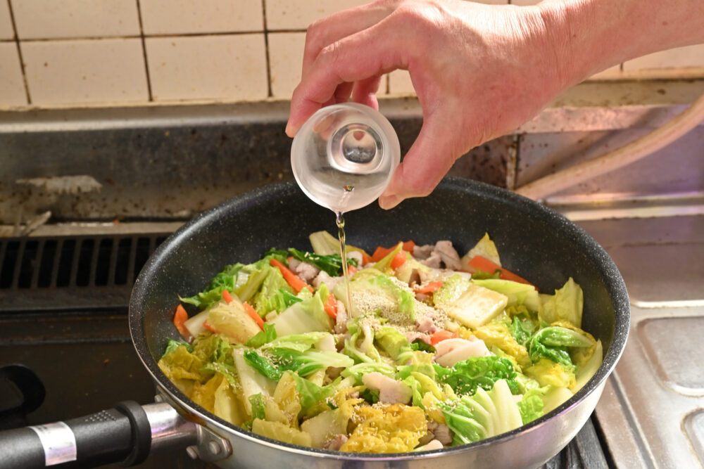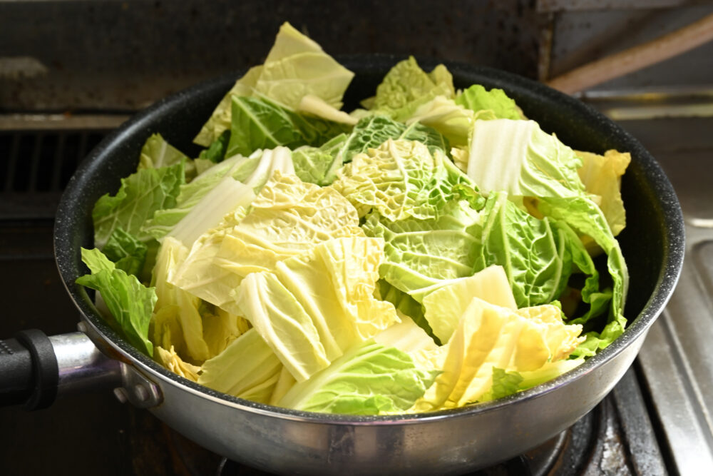 6. 中火で加熱し、白菜がしんなりするまで炒めます。