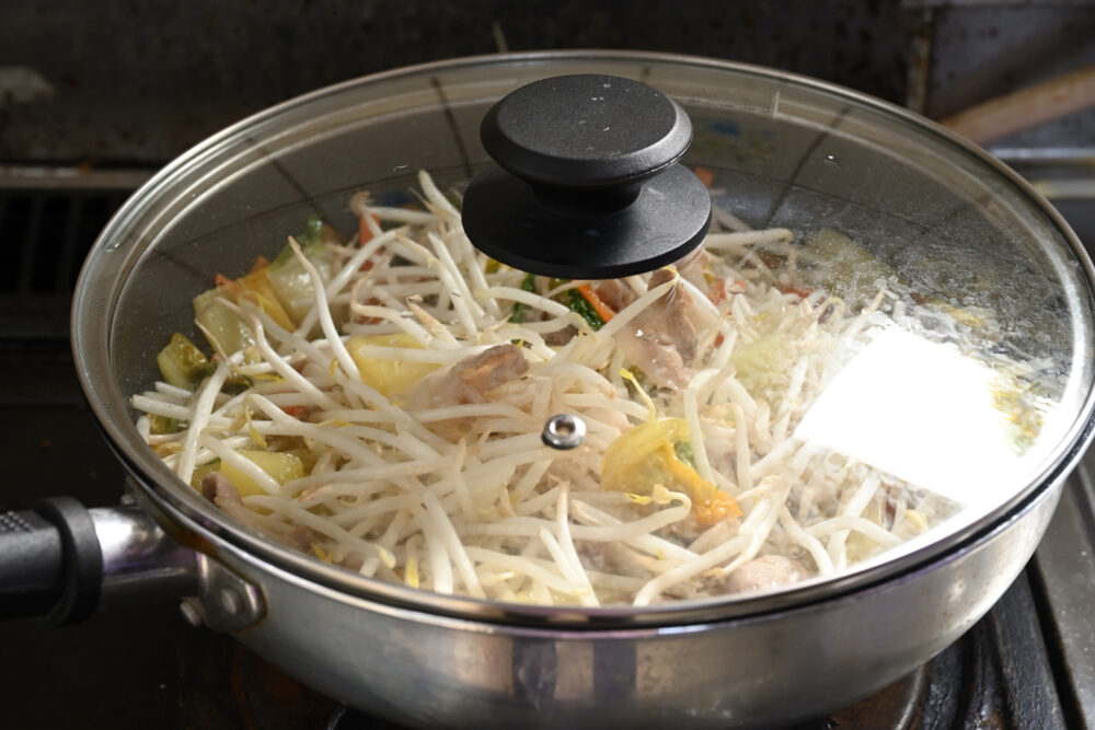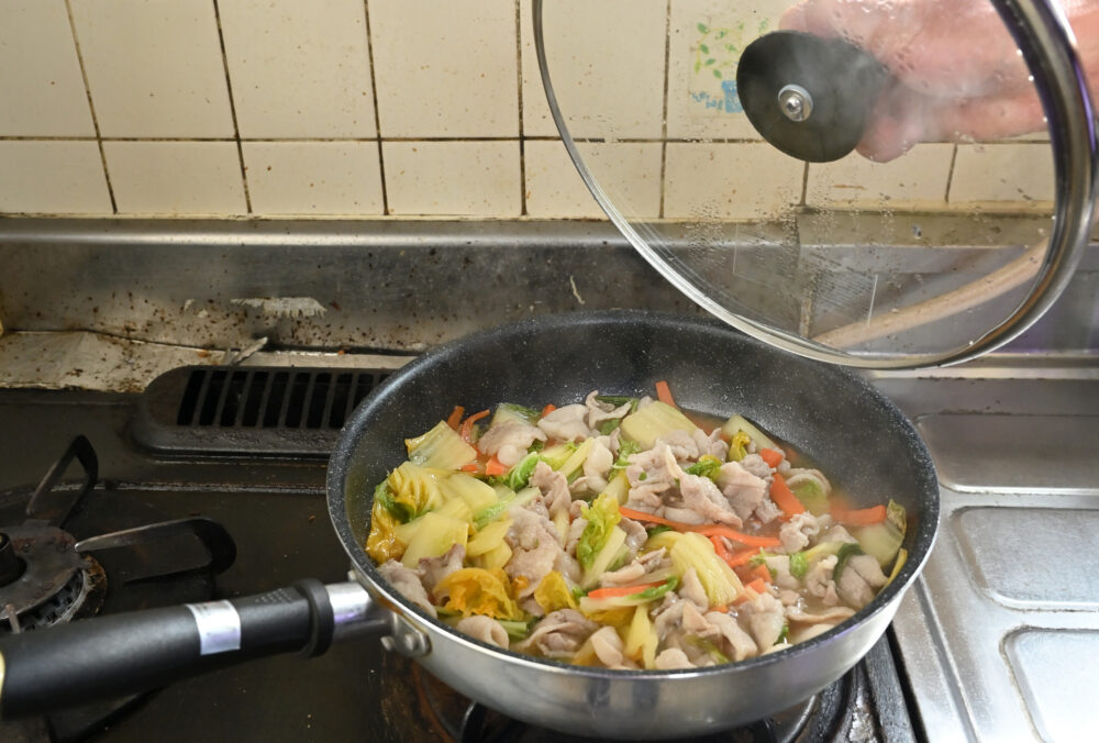 10. 調味料を全体に馴染ませ、弱火にし蓋をして5分煮込みます。