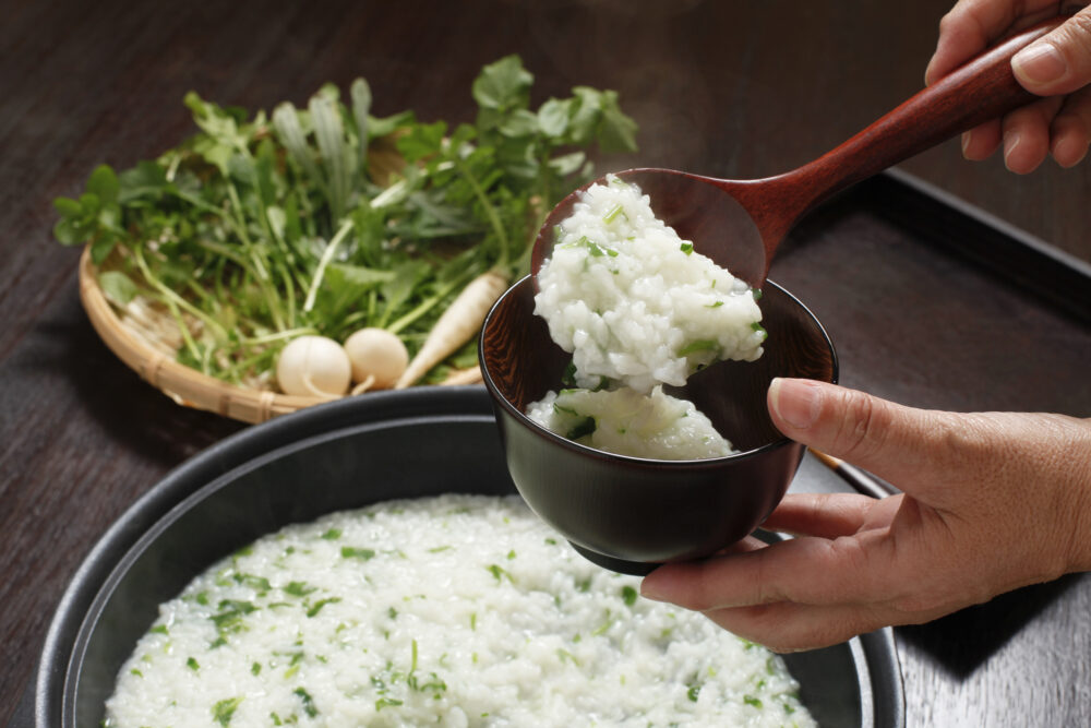 無病息災を願い、1月7日に春の七草(セリ、ナズナ、ゴギョウ、ハコベラ、ホトケノザ、スズナ、スズシロ)の入ったお粥「七草粥」を食べます。早春に芽吹いた七草には邪気を払う力があるとされ、その若芽を食べることで一年を健康に過ごせるようにという願いが込められています。年末年始の暴飲暴食で弱った胃腸を優しくいたわるにも効果的です。
